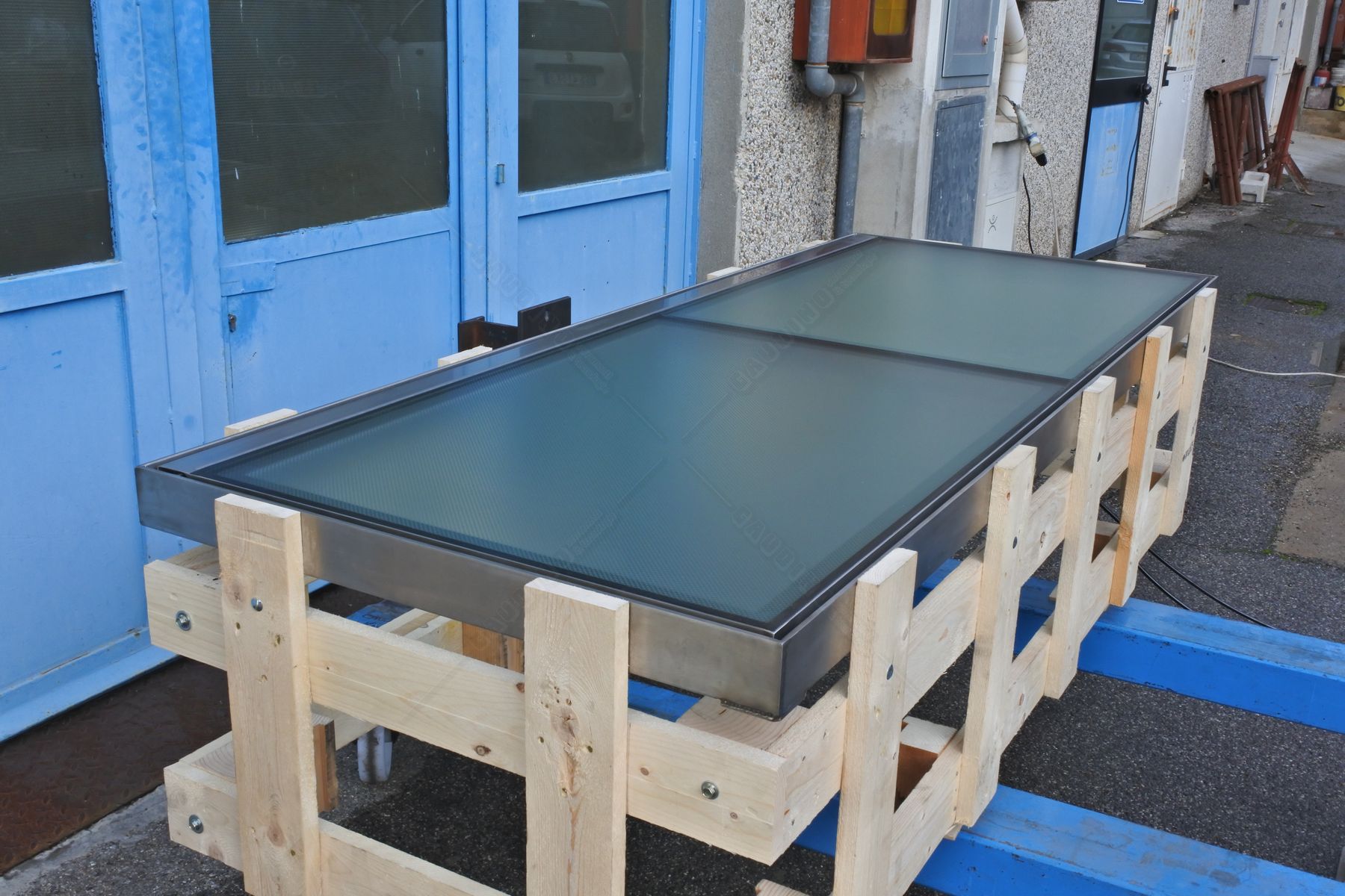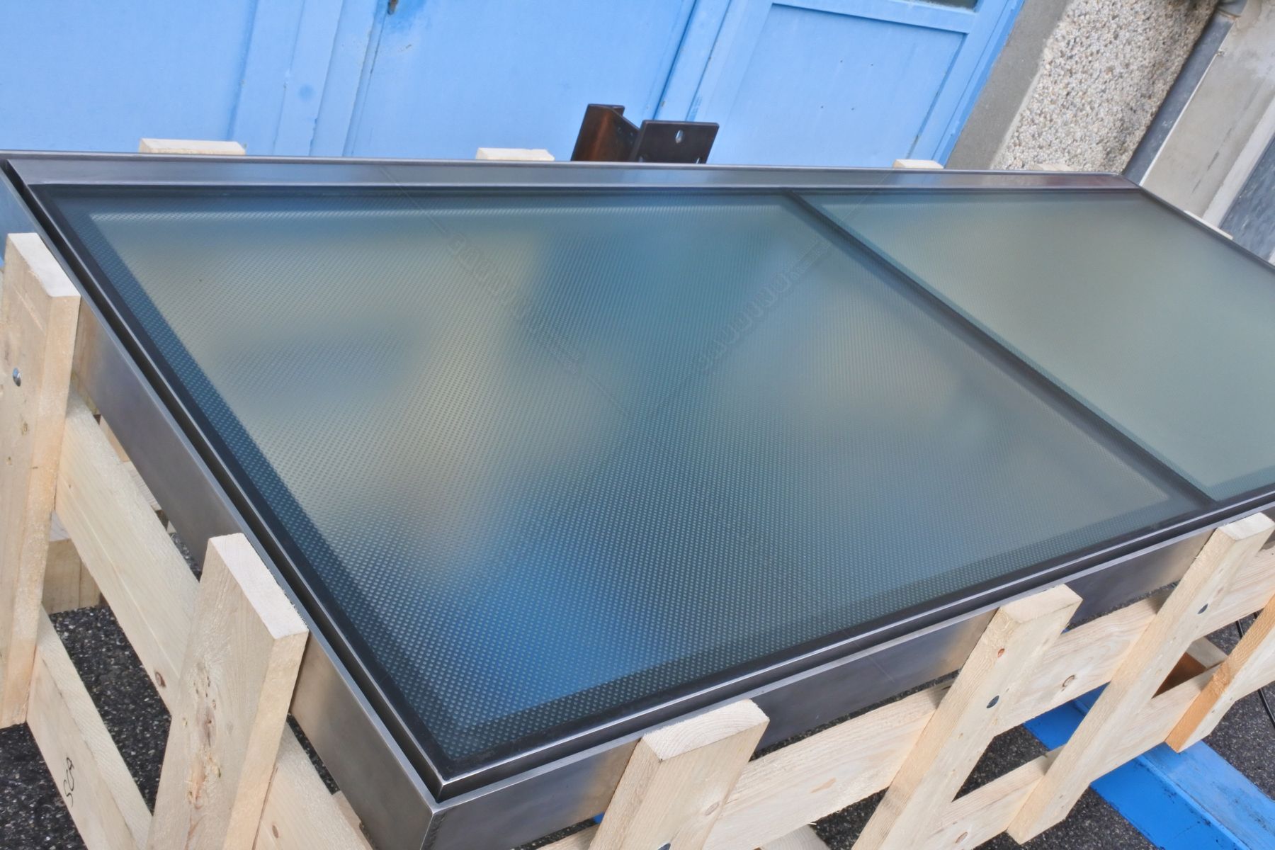 Botola calpestabile in acciaio e vetro a filo pavimento, da interno