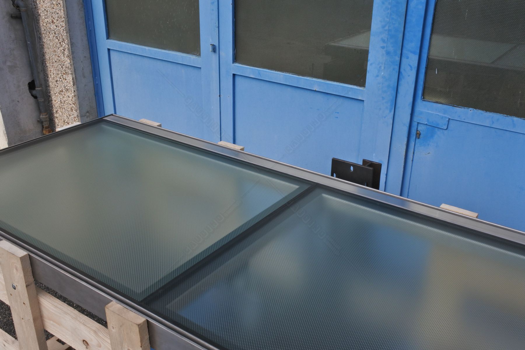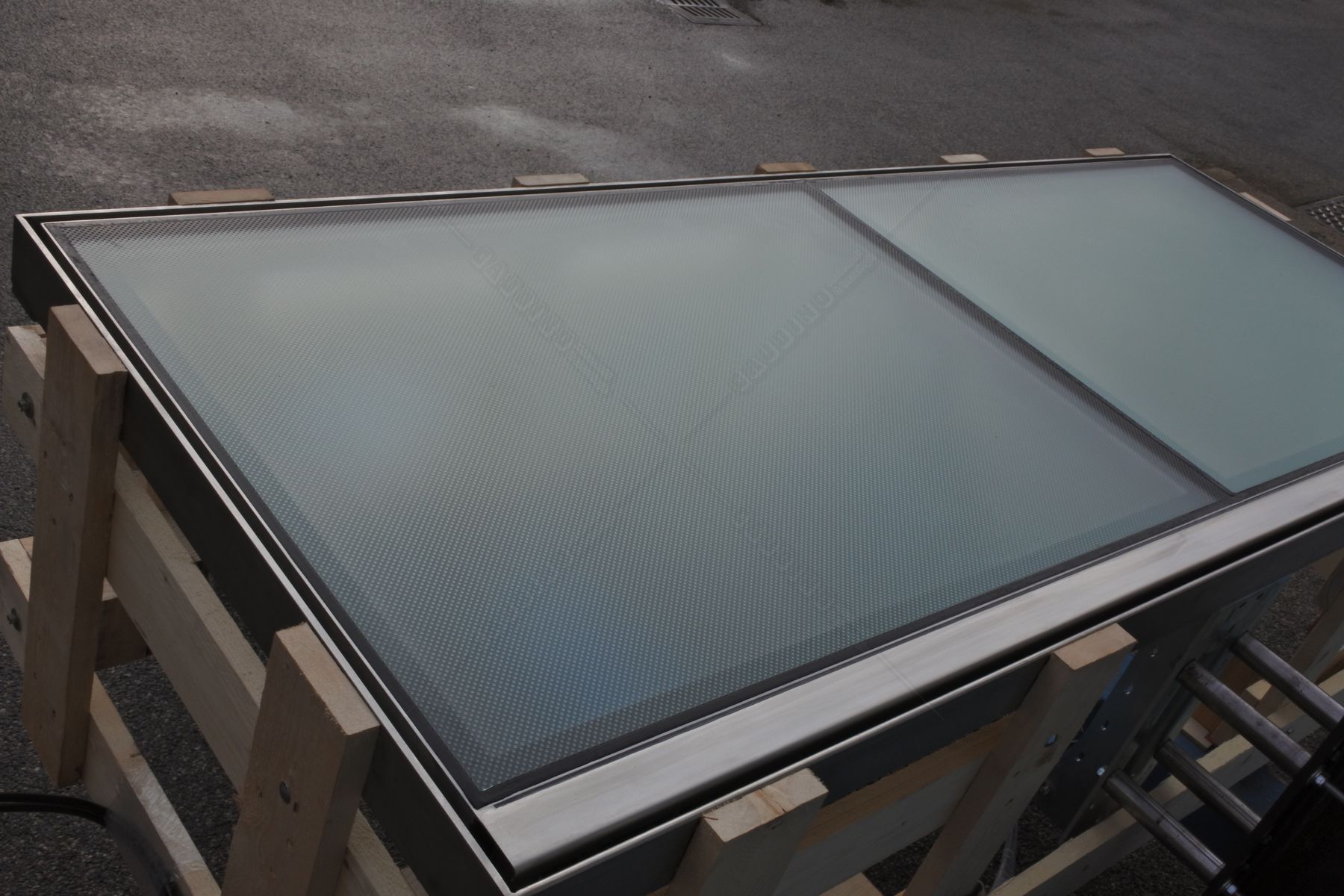 Botola vetrata motorizzata oleodinamica, luce foro 190×80 cm, Pixel satinato